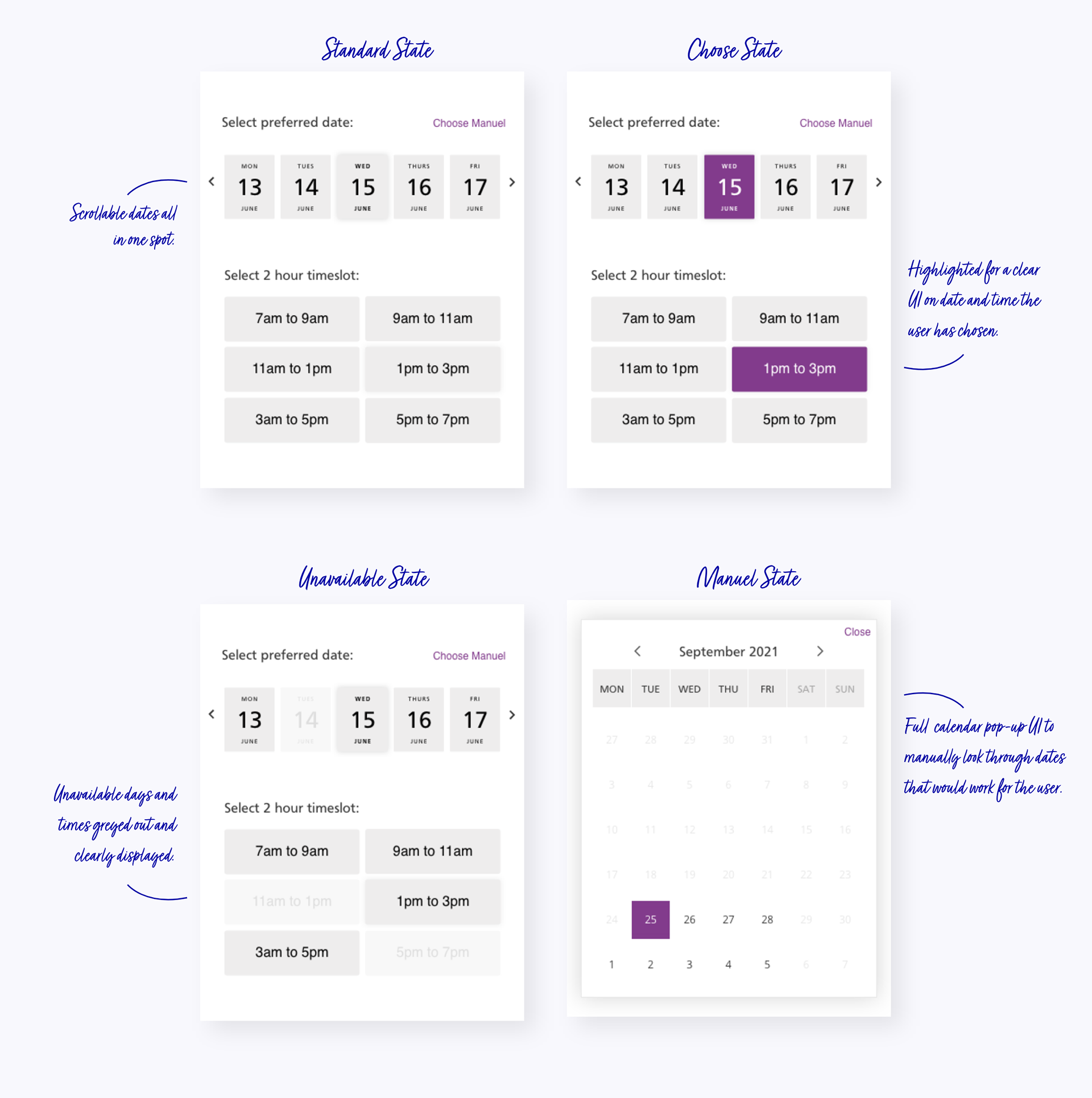 For added flexibility, I introduced a manual calendar pop-up that let users jump to specific dates instantly. The design language was clean and clear: greyed-out dates for unavailable slots, highlighted selections for chosen dates, creating a confident navigation experience.