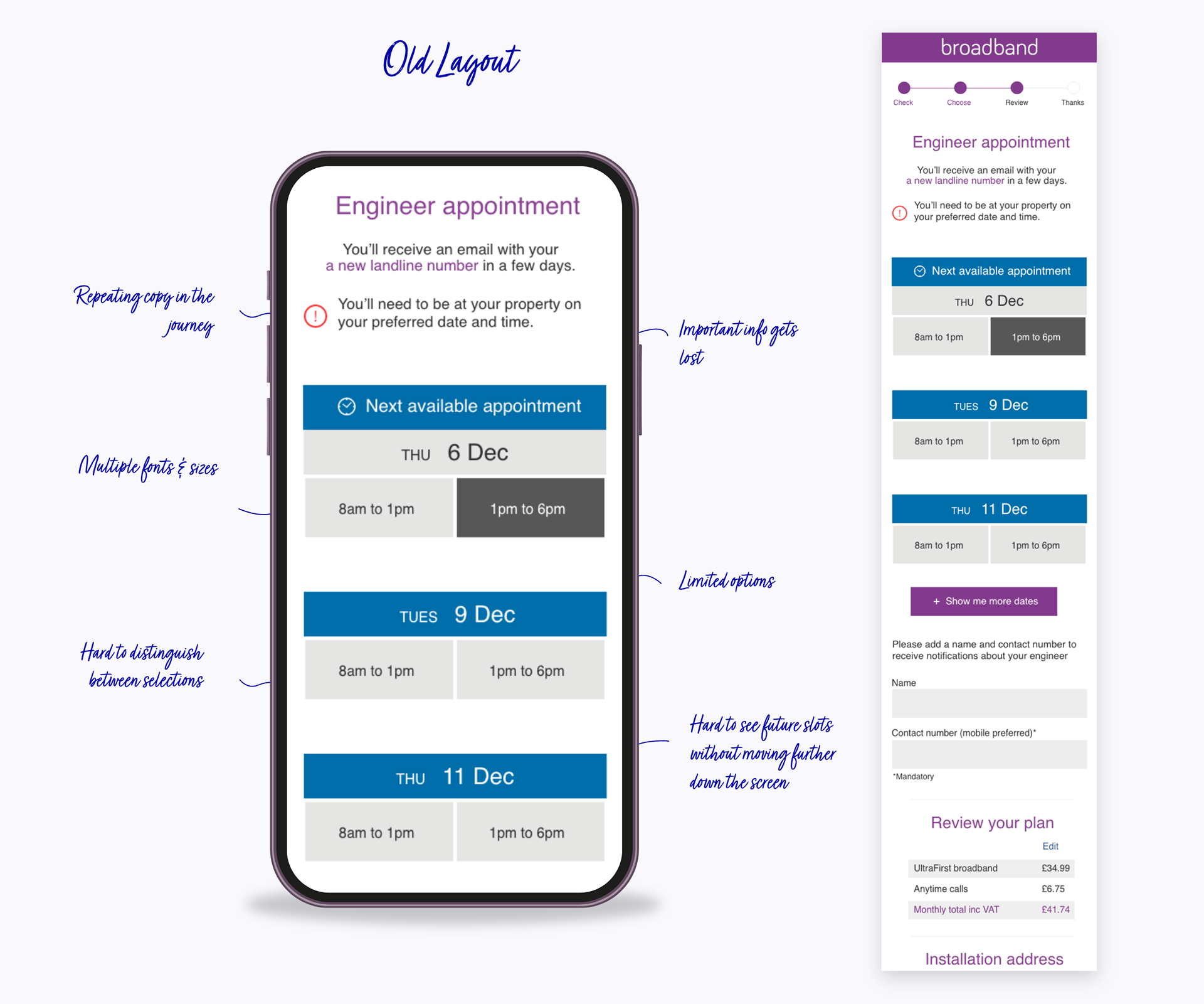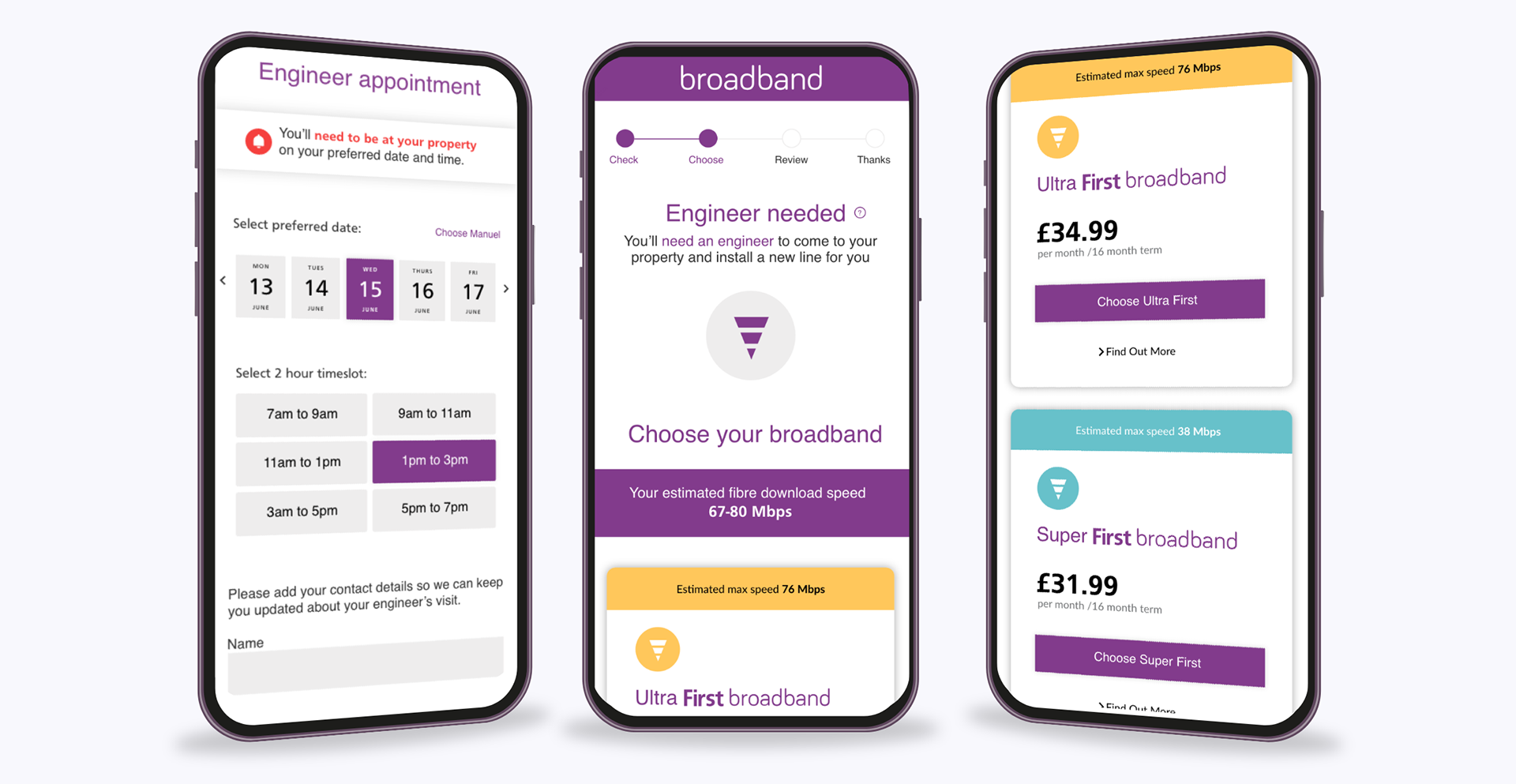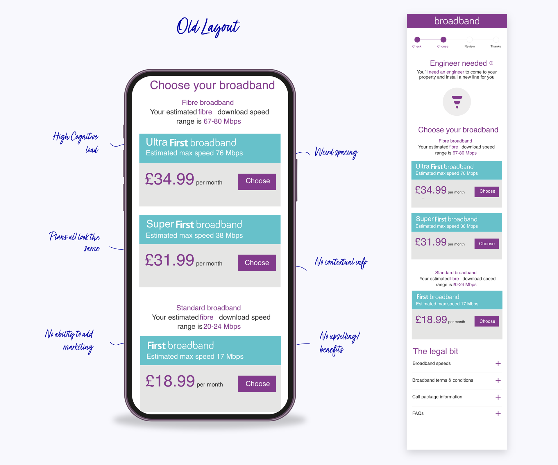 When I joined First Utility's Telco team, I inherited a conversion crisis where users were abandoning the onboarding journey in droves. The cluttered interface buried promotional offers and plan differentiators, while unclear plan options left customers confused about critical details like "free installation." The abandoned carts painted a clear picture: potential customers were walking away frustrated before completing their journey.