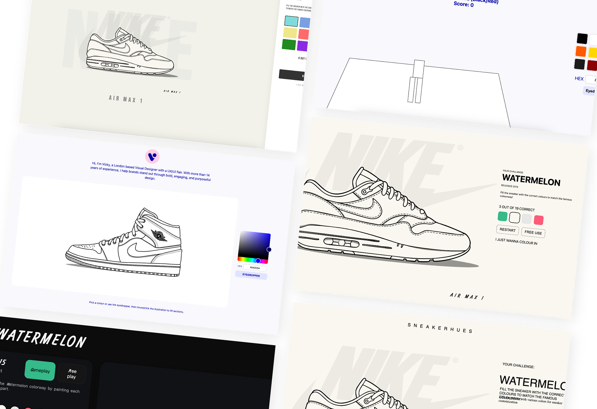 SneakerHues is a self-initiated project exploring AI as a collaborator in design and prototyping. Inspired by my past hobby of customising sneakers for TV and movies back in the day, I set out to create a simple desktop web app where users can colour sneaker layouts and download their creations.