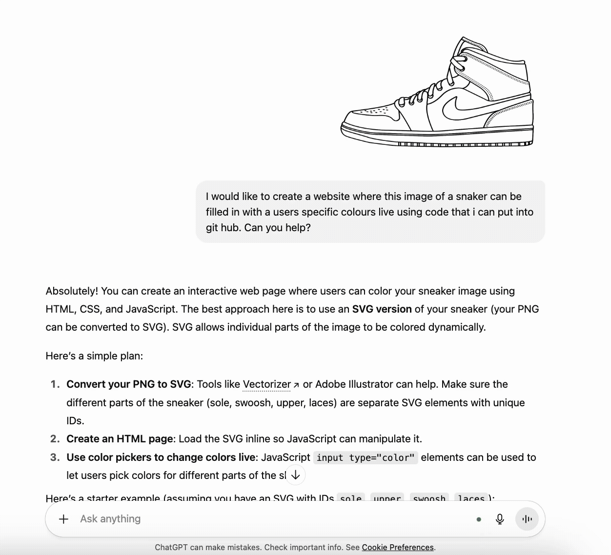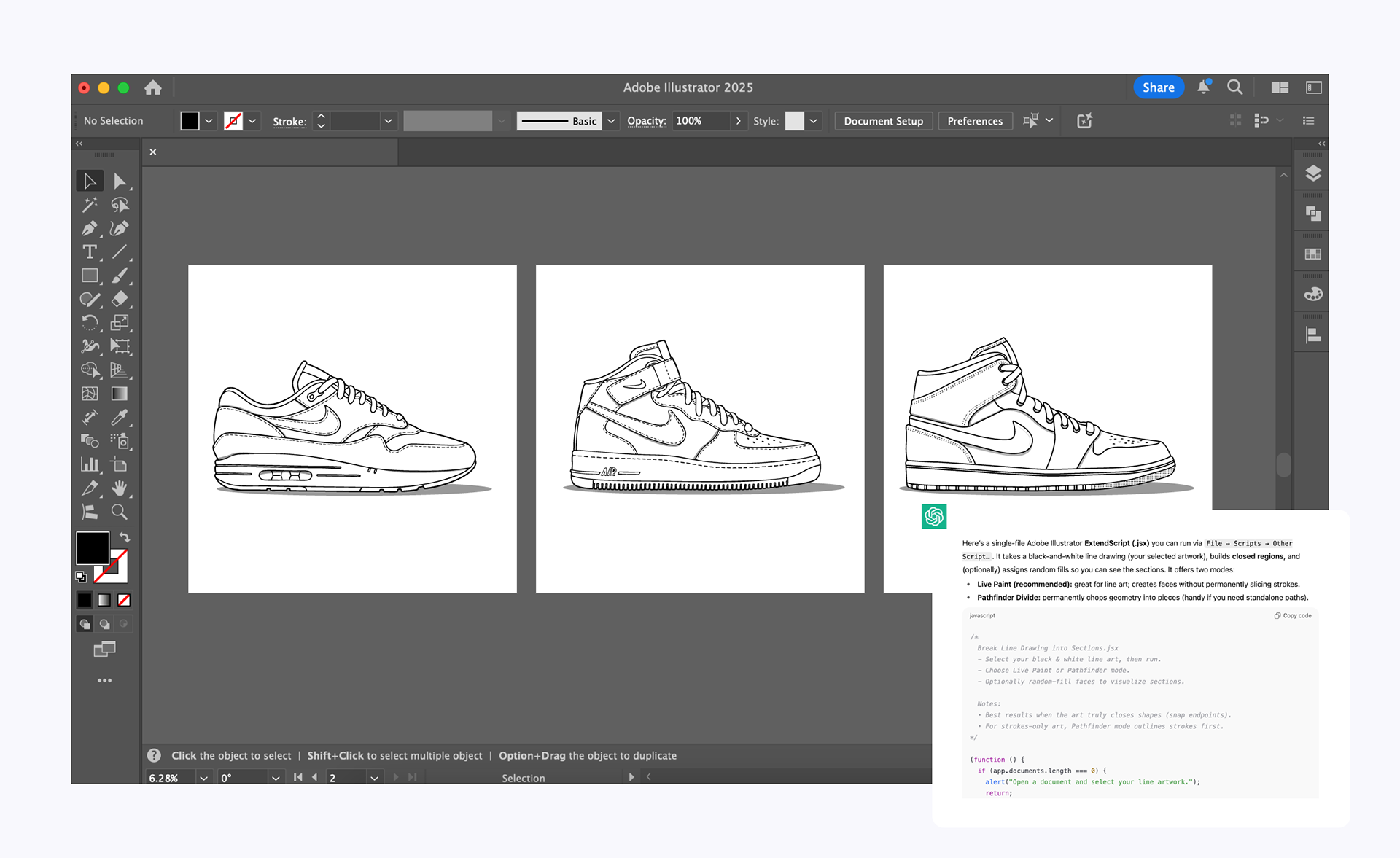 My first step with ChatGPT was turning my sneaker layouts into interactive assets. I asked GPT to generate a script for illustrator to vectorise my designs and assign the files correctly for an interactive asset. The results initially looked promising but that was short lived.