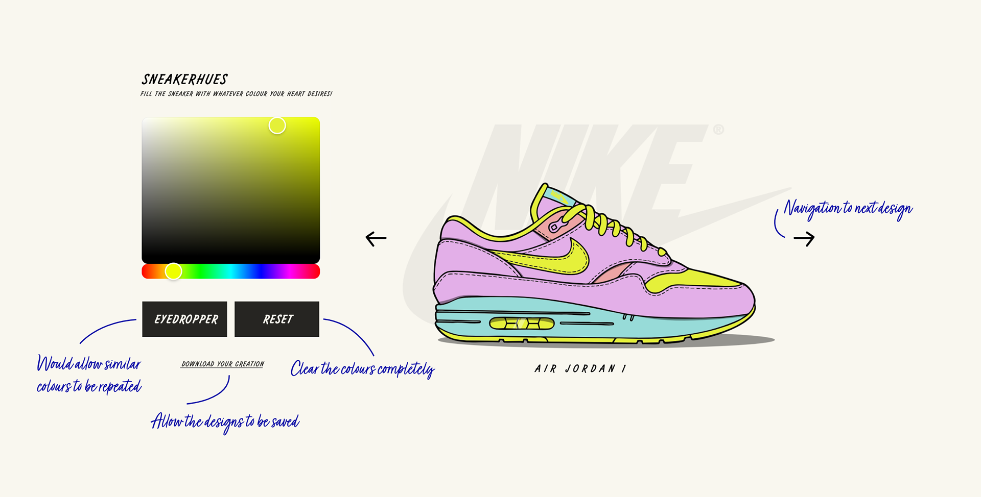 The final result was SneakerHues: a simple, interactive web app that lets users pick a sneaker, colour in each section, restart if needed, and download their finished design. The interface is clear and intuitive, built on AI-assisted code shaped by my design direction and iterations. What started as static Illustrator layouts and a dream evolved into a working prototype.