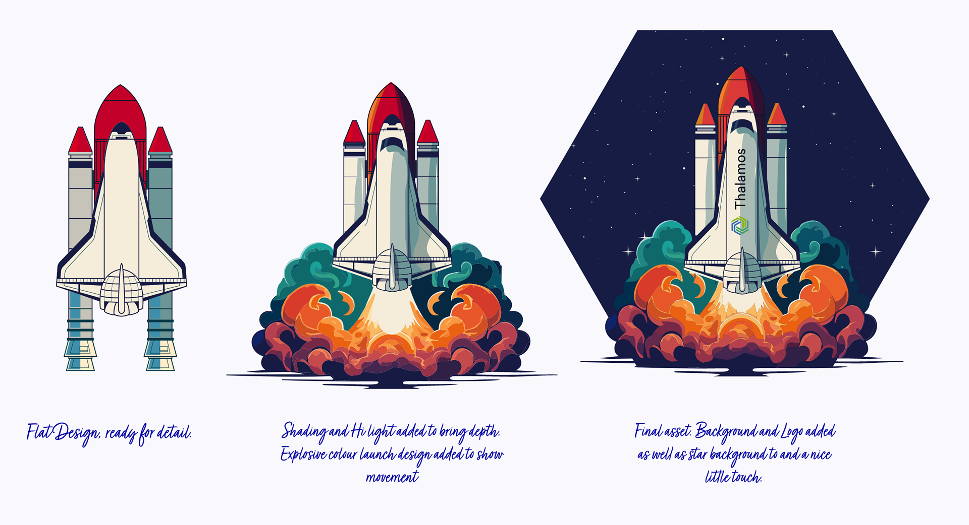 As the concept started to take shape, the illustrations began to evolve. I originally explored a flat vector style, but I decided it didn’t quite fit the tone I was after. I shifted towards a more modern, detailed approach, introducing shadows, highlights, and extra texture to bring more energy and depth to the visuals.