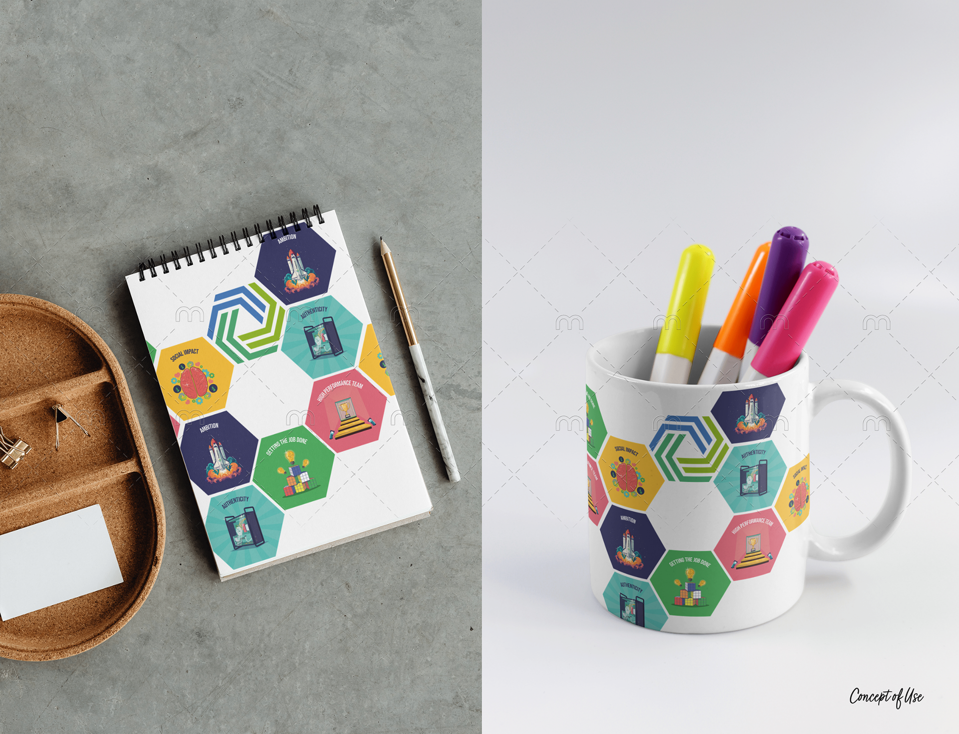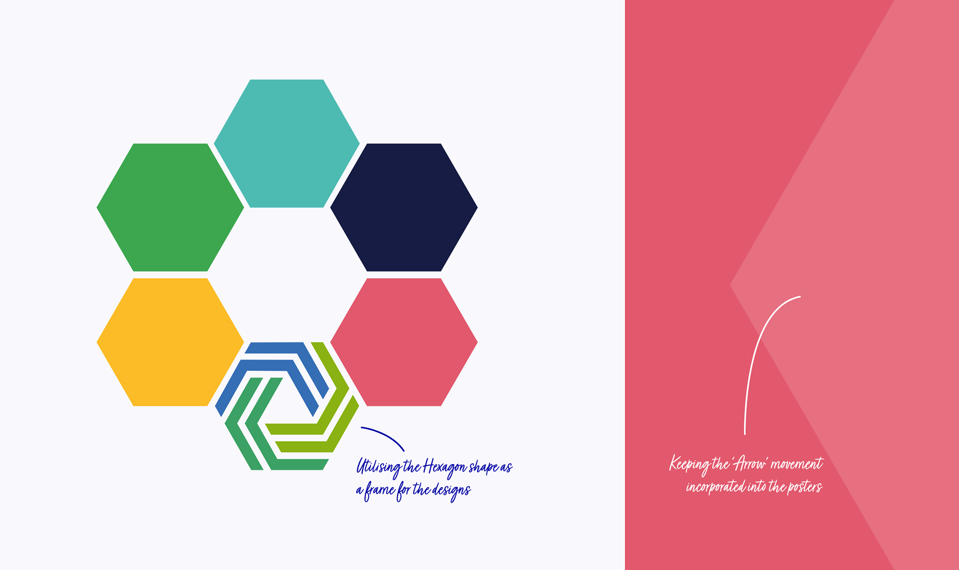 Each design fit neatly within the hexagon, working well alone or as a group. Tiled together, they formed a cohesive, intentional pattern. To create flow, I added faint hexagon shapes at 20% opacity, linking the visuals side by side—subtle cues reflecting Thalamos' joined-up approach.